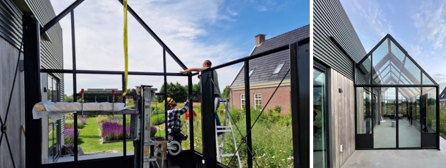 serre van staal Alweer een serre van staal opgeleverd. Bij ieder project proberen we weer nieuwe vormen en toepassingen van ons unieke kozijn systeem.