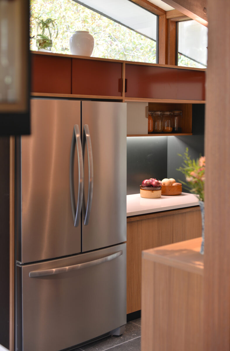 Als materiaal hebben we gekozen voor een natuurlijke uitstraling die aansluit op de rest van het huis en past bij de keukens uit de Mid Century. Afrormosia hout is toegepast in combinatie met stalen schuifdeuren in een uniek kleurpalet. Samen met de nieuwe raampartijen vormt deze keuken weer het hart van deze woning.
